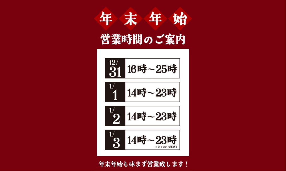 【重要】2025年の年末年始営業時間のお知らせ(休まず営業いたします)